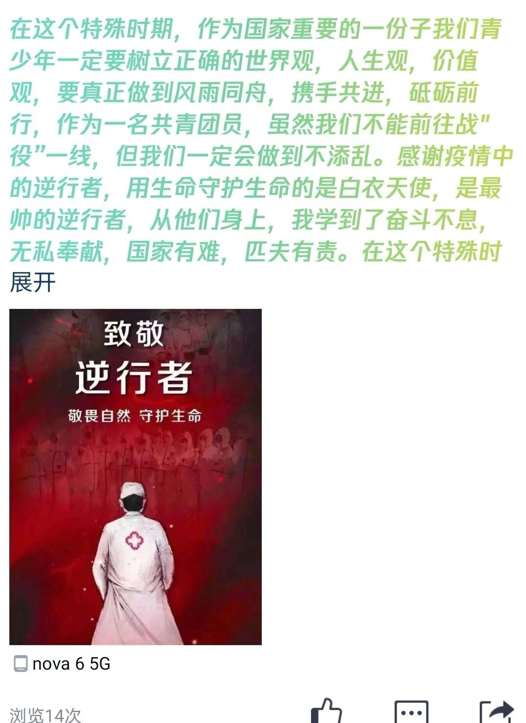 在线上活动中,各班级同学积极参加,出谋划策,共同商讨活动形式。活动过程中,同学们纷纷发表自己的想法,讲述着疫情中的所见所闻,感悟中国特色社会主义制度的优势,表达对党和国家领导人的感激与崇敬之情。活动成果丰富多彩,各式各样,但无不体现着同学们对制度的高度自信,以及勇于参加疫情防控工作的奉献精神,彰显了新一代老员工的责任与担当,绽放青春力量。