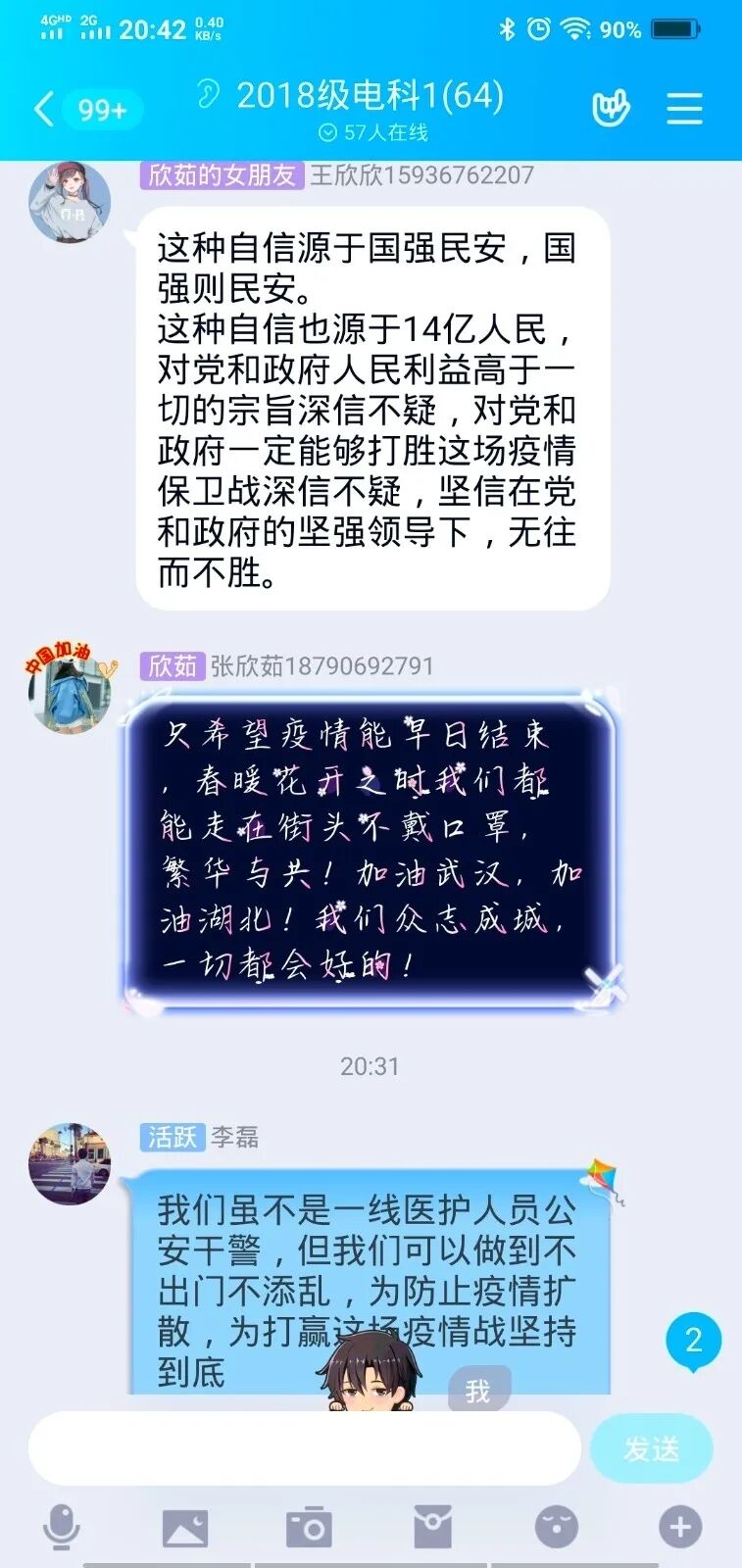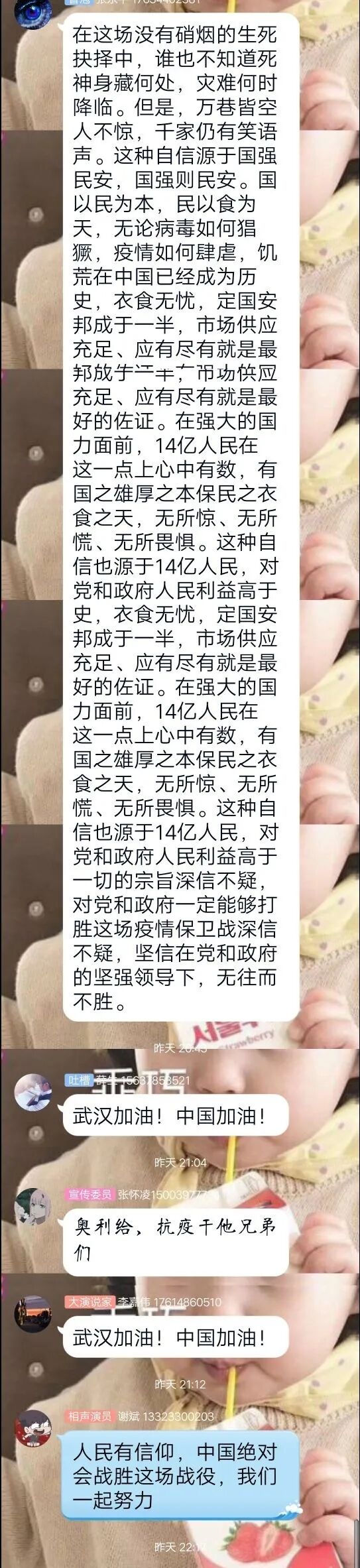 此次活动中,各个团支部同学搜集关于主题各个方面的资料素材,结合自己的所见所闻及参与疫情防控的经历,对“疫情中的中国自信”进行了激烈的云讨论。每位同学都兴致高涨,激动不已,赞扬着用生命捍卫生命,以牺牲阻拦牺牲的抗疫一线工作人员,并且表达了对他们最崇高的敬意。同时也歌颂着党中央统筹协调各方面工作,疫情期间经济社会发展、脱贫攻坚也不落下的强大领导力,真正看到了中国奇迹,中国力量和中国速度。从中,能深刻感受到同学们深深的爱国之心和对祖国力量的坚信,也彰显了新一代老员工的责任和担当!