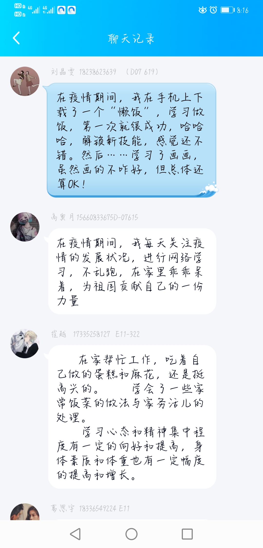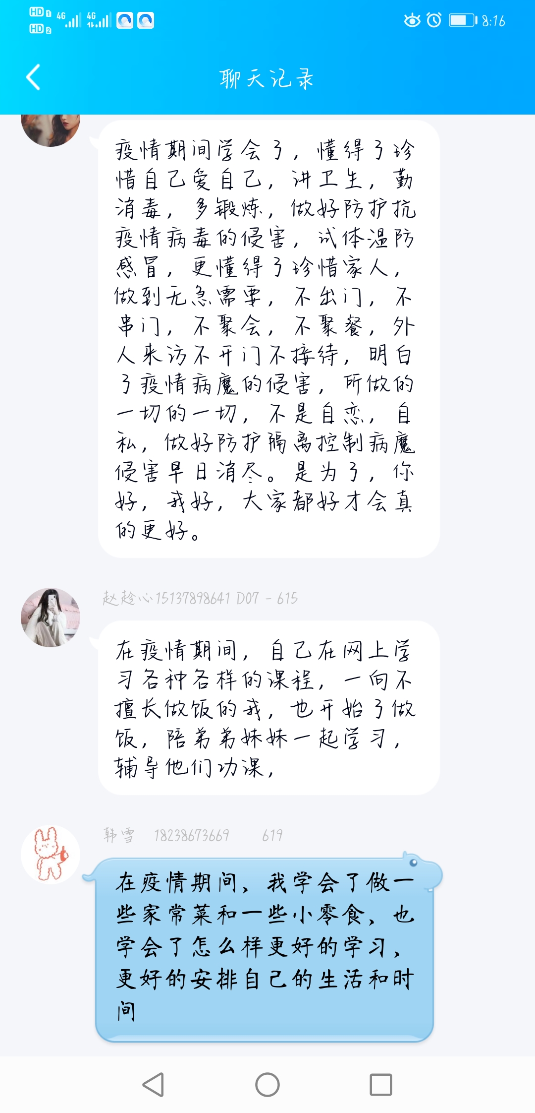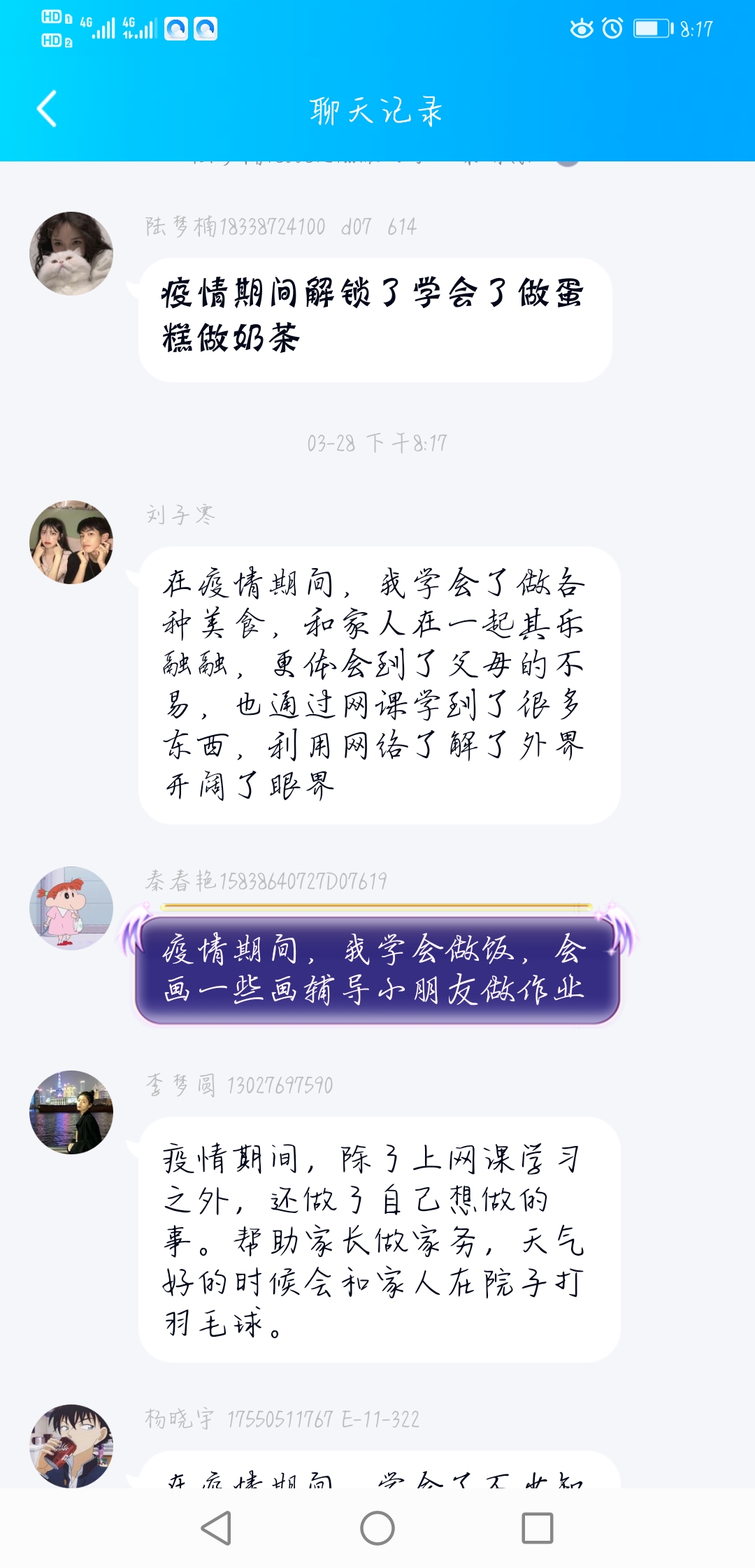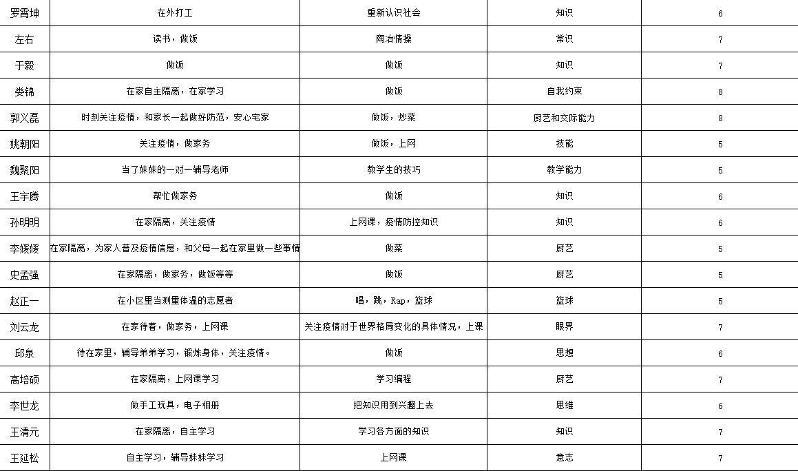 在此次活动中,同学们积极参与,都不同的展示了自己在家所学到的不同本领与技能。有的同学在家学会了做饭,从每天吃妈妈做的饭到吃到自己亲手做的饭,也确实别有一番风味。还有一些同学为了锻炼自己强大的意志力,每天开始锻炼自己,增强自己的自制力。为了就是在家也可以为社会做贡献。记得习近平总书记说过“我一定亲自指挥,只要我们坚定信念,同舟共济,我们一定会战胜这次疫情。于是不少同学挺身而出,主动要求参加“战役”,他们在小区门口为进出的人们测体温,做记录,一刻也不懈怠。他们都很骄傲的为这次疫情中的自己打了分。