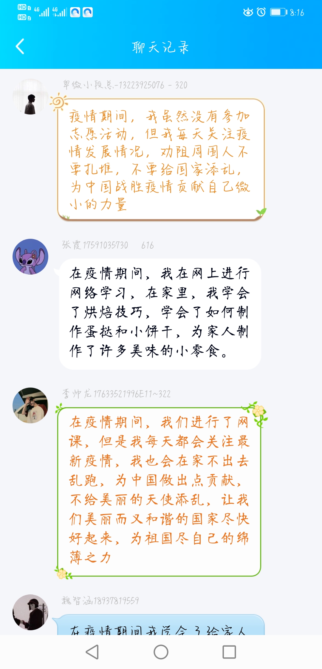 通过此次活动中,激发了同学们在家也要为社会做贡献的热情,展现了一心要战胜疫情的信念。他们坚信在党中央的统一领导和全国人民的共同努力下,我们一定会战胜这次疫情。