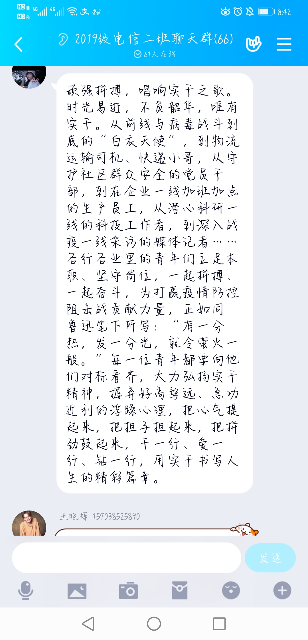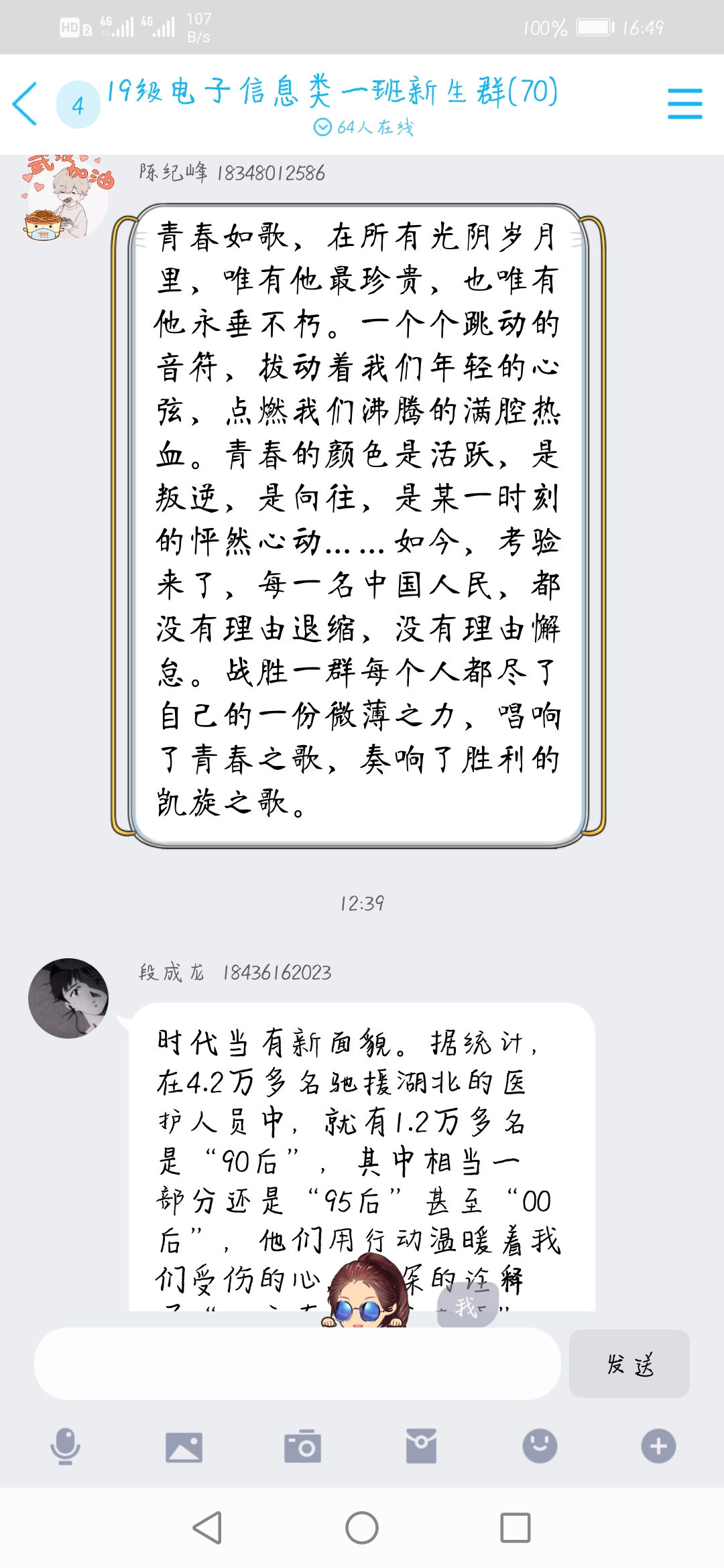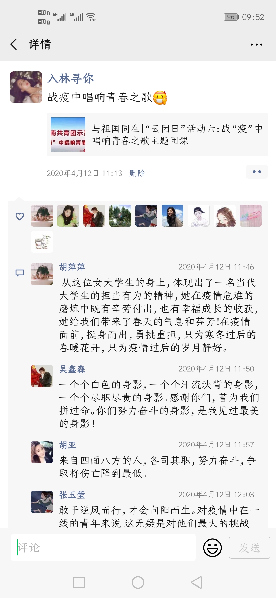 首先在各班团支书的组织下,各班以寝室为单位进行了唱团歌、国歌的视频录制。每位同学都积极参与,虽然此次活动是线上活动,但同学们都非常认真的对待,克服一切困难来进行视频的录制,声音洪亮地唱着团歌、国歌,并按时交给了团支书。在全体同学的配合、共同努力下,此次云团日活动在同学们充满自信的嘹亮的歌曲声中圆满结束。