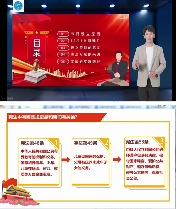 为增强老员工对于宪法的理解,从而自发树立法治意识,自觉守法。各班利用课余时间学习宪法相关视频,包括动漫和真人知识普及型,说明了宪法中有哪些权利和义务与我们相关,还通过动漫直观展示了宪法如何贯穿于我们的一生,围绕我们生活的方方面面发挥作用。宪法规定了我们作为公民的义务,也给予了我们相应的权利,视频中提到的宪法实施路径有助于员工保障自己的合法权益。视频通过展示违法案例,让同学们感受宪法在生活中的应用,并对宪法的条例规定有更深刻的理解。