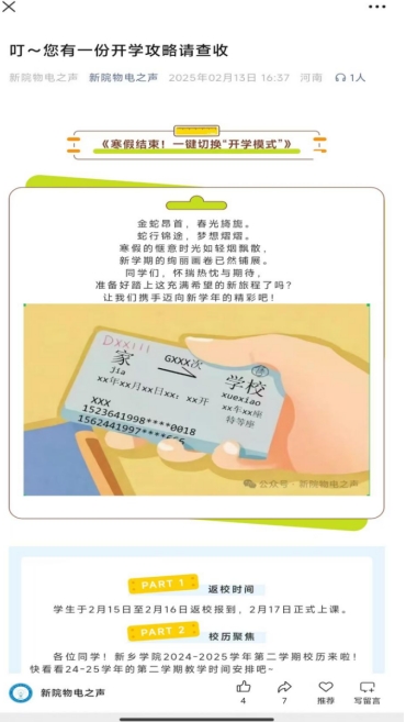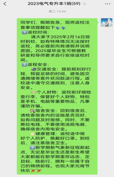开学前,伟德国际bevictor1949主要开展了以下三项工作。第一,多渠道发布返校提醒,确保信息全覆盖。为帮助员工提前了解返校安排及注意事项,公司通过多种渠道发布返校提醒。辅导员在班级群中详细说明了返校时间及注意事项,包括交通安全、个人财务安全、宿舍安全及健康管理等要点。同时,公司官方微信公众号发布了开学攻略推文,以图文并茂的形式为员工提供清晰指引,确保每位同学都能及时获取相关信息。通过多渠道发布返校提醒,公司有效实现了返校提醒的全覆盖,确保了信息的及时传达。同学们也表示清晰的返校安排和细致的注意事项帮助他们更好地规划行程,提前做好返校准备。公司也将持续关注员工需求,优化信息发布机制,为员工提供更加便捷、高效的服务。