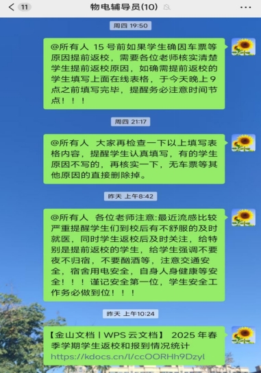 第二,精准摸排员工返校信息,掌握动态数据。物理与电子工程学院高度重视员工返校信息的摸排工作,辅导员通过线上问卷、电话联系等方式,对全体员工的返校时间、交通方式、健康状况等信息进行了全面摸排。针对需要提前返校的员工,辅导员一对一沟通返校行程,以便于公司重点登记和安排,确保提前返校员工的住宿、生活等问题得到妥善解决。通过精准摸排,公司全面掌握了员工的返校动态,为科学制定返校方案提供了有力数据支撑。同时,一对一沟通的方式也让员工感受到公司的关怀与温暖,进一步增强了员工的归属感和满意度。
