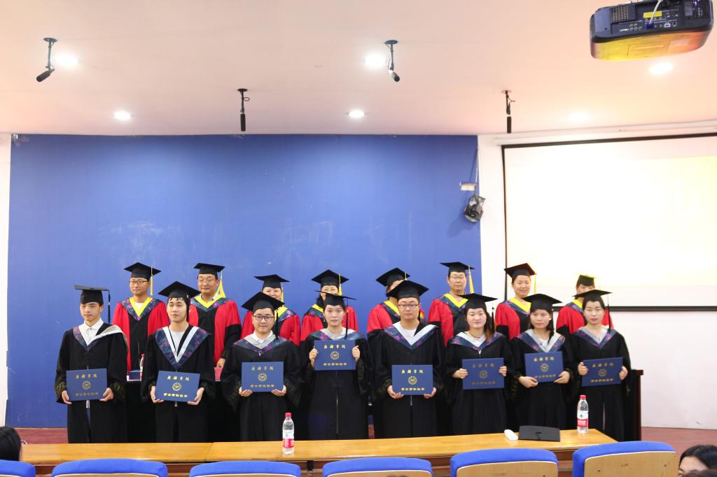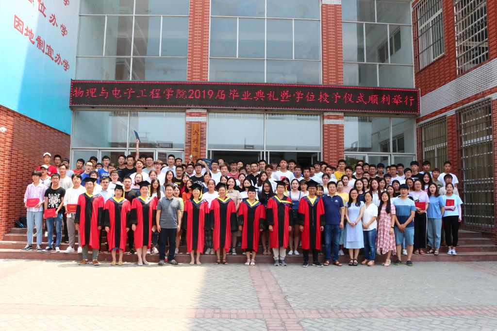 会议伊始,孙汝斌老师组织全体人员奏唱国歌,并宣读2019届优秀毕业生人员名单,其中院校级优秀毕业生共计22人,省级优秀毕业生5人。随后毕业生代表王志新同学、教师代表李在林老师、和在校生代表张辰毓同学分别上台发言;徐彦老师宣读授予学士学位人员名单及专科毕业生名单,其中本科毕业生授予学士学位共计142名同学,包括物理学42人,电子信息科学与技术100人,专科毕业生共计89人获得毕业证书。最后,程素君老师上台致词,她为即将踏上新征途的同学们送去祝福,希望同学们以崭新的姿态,挂起奋进者的风帆,去开拓人生的新航道。