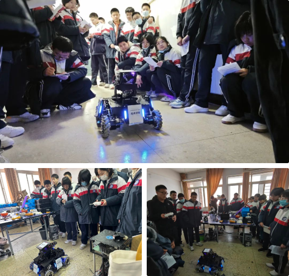 第四站是电子设计与创新实验室,地上琳琅满目的机器零件和机器人的精彩表演让同学们惊叹不已:一个小小的机器人,从设计到组装,从选择材料到一身本领,这个过程是那么新奇,大家也对智能机器人产生浓厚的兴趣,好几个孩子当场宣布:“我大学就要学这个专业!”这句话引发在场同学的阵阵笑声。