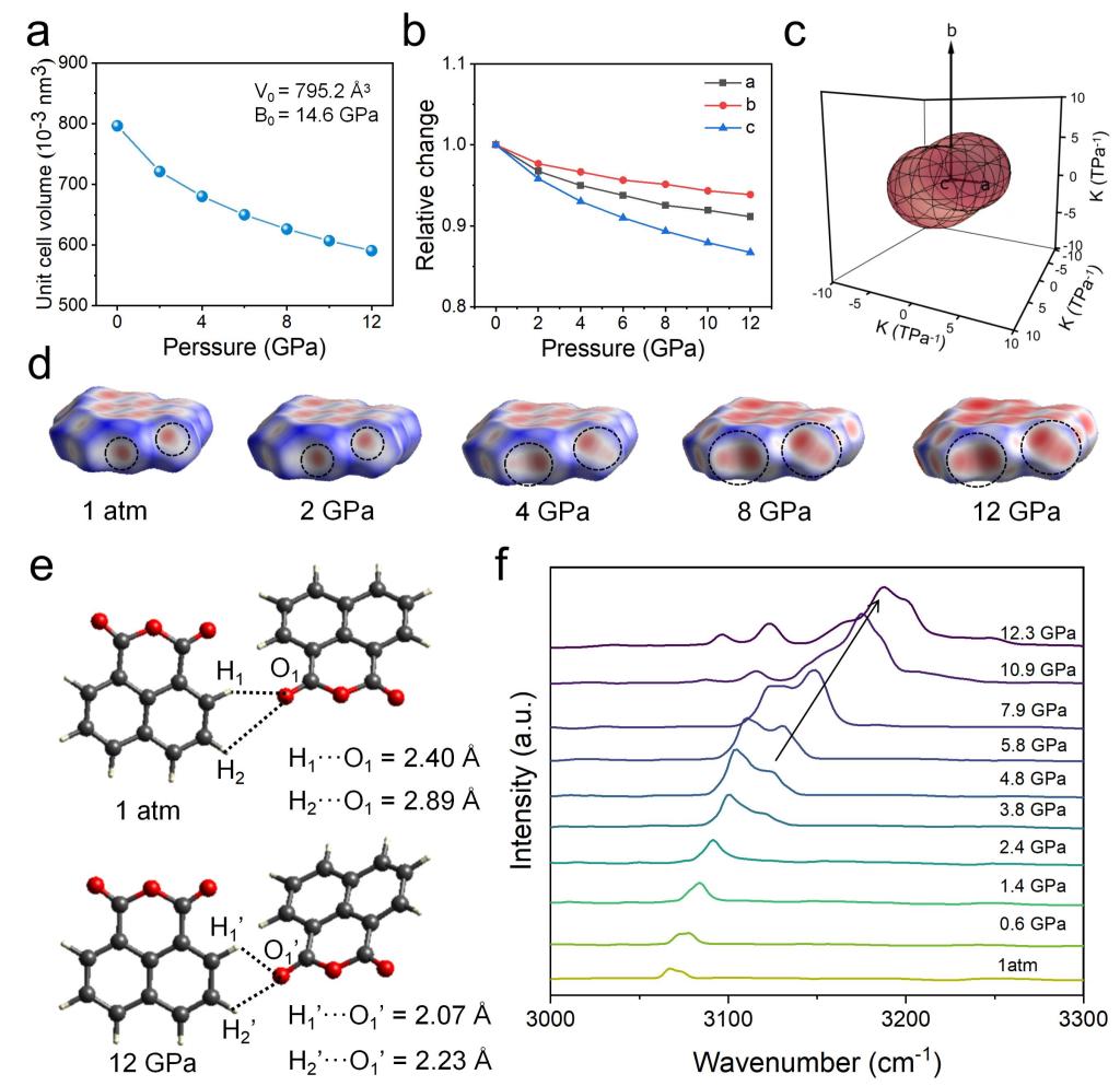 图3. (a) 理论计算的萘酐晶体晶胞体积在加压过程中的演变;(b)萘酐晶体a、b和c轴的相对压缩率;(c)萘酐晶体在a、b和c轴方向上的压缩性指标;(d)不同压强下萘酐晶体中分子的Hirshfeld表面;(e)在1 atm(环境条件)和12 GPa下萘酐晶体中的氢键示意图;(f)不同压强下萘酐晶体从3000到3300 cm-1的红外吸收光谱。