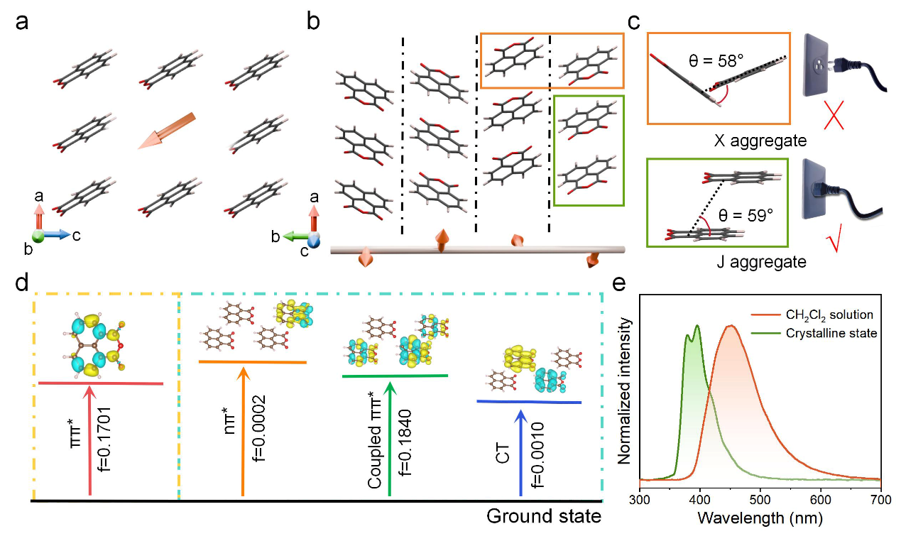 图1. (a,b)萘酐(Naphthalene Anhydride)晶体的结构示意图;(c) 萘酐晶体分子堆积角度;(d)萘酐单体和四聚体中从激发态到基态的电荷差分密度图,蓝色区域表示电子密度降低,黄色区域表示电子密度增加;(e)结晶态萘酐及其在二氯甲烷溶液中的荧光发射光谱。
