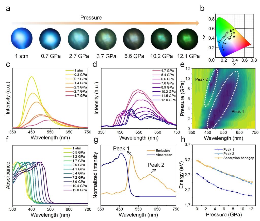 图2. (a) 萘酐晶体在紫外光(λ = 355 nm)照射下的荧光照片;(b)不同压强下萘酐晶体荧光发射的色位坐标图;(c、d)不同压强下萘酐晶体的荧光光谱;(e)不同压强下萘酐晶体的归一化二维伪彩色荧光发射图;(f)不同压强下萘酐晶体的吸收光谱;(g)12.0 GPa下的萘酐晶体吸收和发射光谱;(h)峰1和峰2的发射能及吸收带隙。