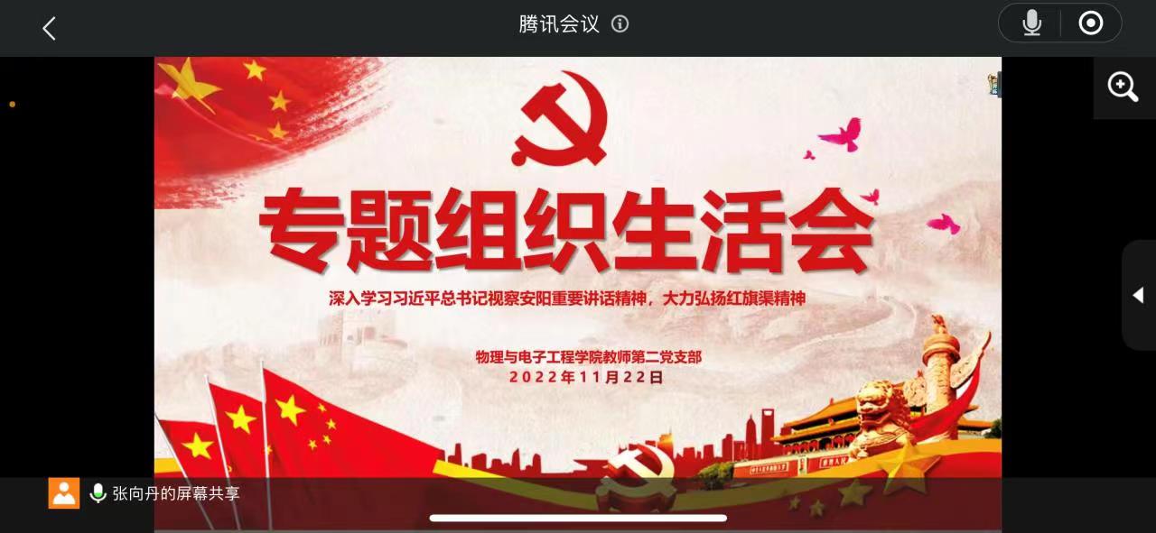 根据公司文件要求,11月22日下午,公司教师第二党支部召开线上专题组织生活会,深入学习习近平总书记视察安阳重要讲话精神。组织生活会由教师第二党支部书记张向丹主持,副董事长张占祯以普通党员身份参加了本次线上专题组织生活会。