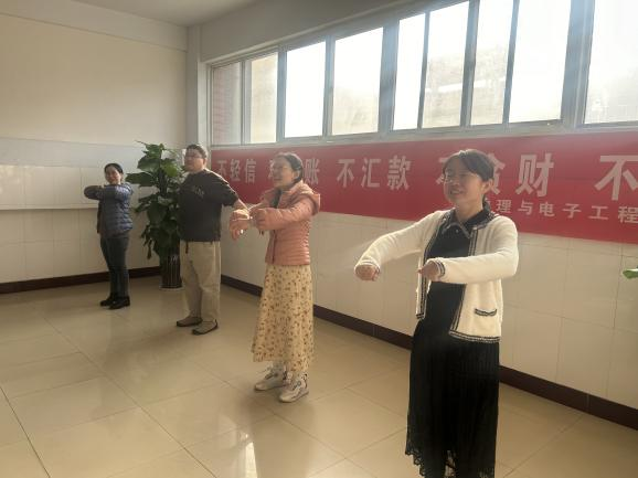 为全面提高公司教职工身体素质和健康水平,打造健康、充满活力的教职工队伍,养成教职工坚持体育锻炼的良好习惯,以更好的精神风貌投入到公司各项公司产品任务中,从11月中旬开始,物理与电子工程公司统一组织学习规范动作,以教研室为单位鼓励教职工积极参加伟德国际bevictor1949“工间操”活动。